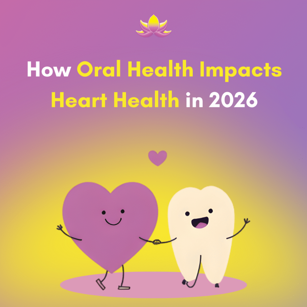 A cute cartoon illustration of a purple heart and a white tooth holding hands under the text "How Oral Health Impacts Heart Health in 2026."